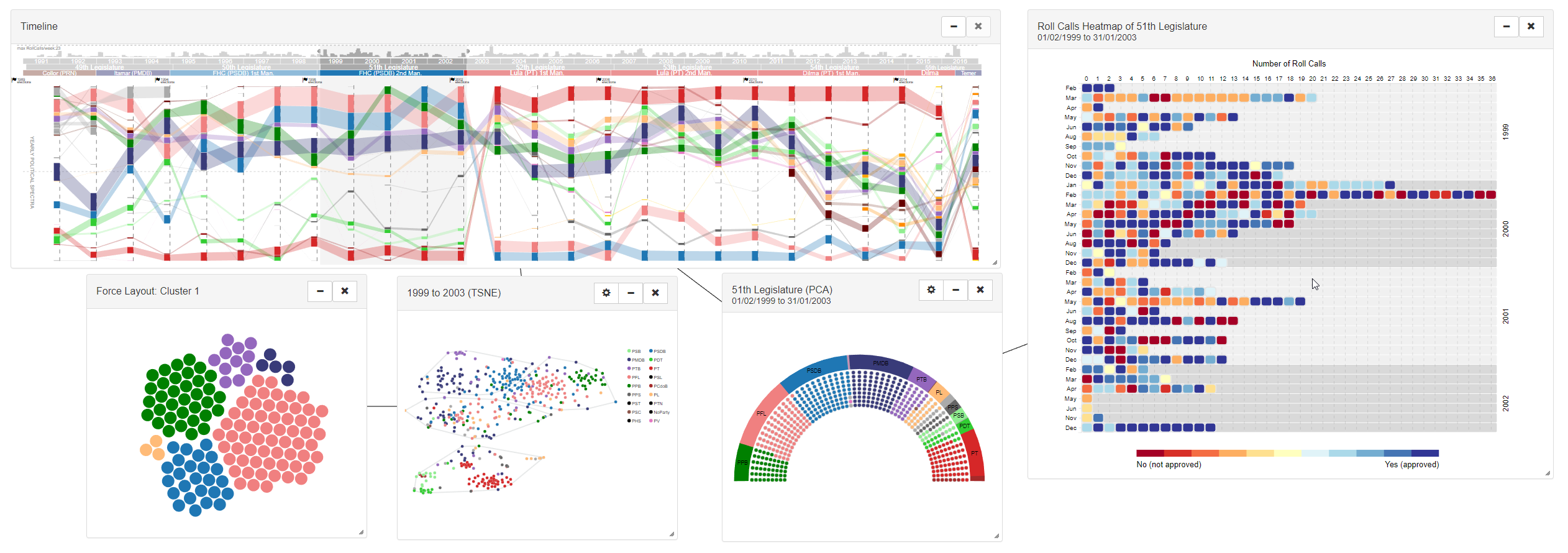 The Original CivisAnalysis directly inspired this work. It is a system for the visualization of roll calls of Brazil’s Chamber of Deputies. Covering roll calls of six legislatures as well as six presidential elections, CivisAnalysis combines roll call visualization techniques with techniques for the visualization of temporal data.